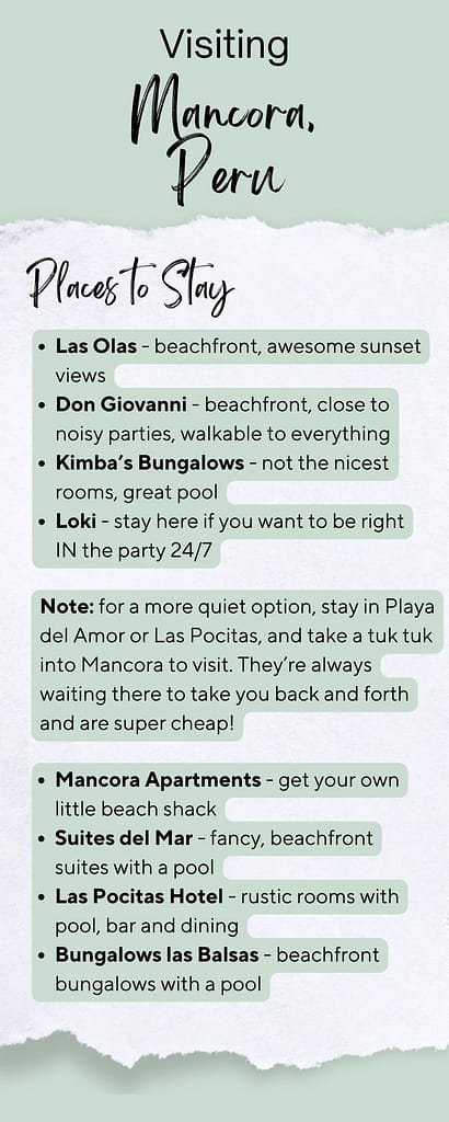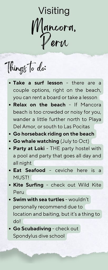 Are you looking to find the best beaches in northern Peru? We’ve been there… Our goal for a lazy, relaxing beach vacation was realized after a whirlwind visit to Cusco, the Sacred Valley and the mystical lost city of Machu Picchu during rainy season. After journeying through the Andes mountains by bus, train, and on foot, we were eager to relax by the ocean with our feet buried in the sand! Our town of choice: Máncora. A quaint surf town nestled along the Pan-American Highway, famed for its turquoise waters, expansive soft sand beaches, vibrant nightlife, and charming boutique hotels.